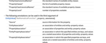 "Source" source information for the property "EntityAssociation" an association of entities and entity-property values "PropertyAssociation" an association of properties and entity-property values "EntityPropertyAssociation" an association in which the specified entities are keys, and values are a nested association of properties and entity-property values "PropertyEntityAssociation" an association in which the specified properties are keys, and values are a nested association of entities and entity-property values "Dataset" a dataset in which the specified entities are keys, and values are an association of property names and entity-property values - The following annotations can be used in the second argument of EntityValue[property,annotation]: