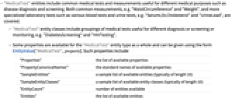 - "MedicalTest" entity classes include groupings of medical tests useful for different diagnosis or screening or monitoring, e.g. "DiabetesScreening" and "HIVTesting".