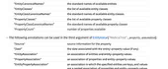 "Source" source information for the property "Date" the date associated with the entity-property value (if any) "EntityAssociation" an association of entities and entity-property values "PropertyAssociation" an association of properties and entity-property values "EntityPropertyAssociation" an association in which the specified entities are keys, and values are a nested association of properties and entity-property values "PropertyEntityAssociation" an association in which the specified properties are keys, and values are a nested association of entities and entity-property values "Dataset" a dataset in which the specified entities are keys, and values are an association of property names and entity-property values - The following annotations can be used in the second argument of EntityValue[property,annotation]: