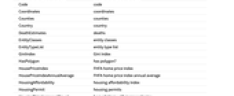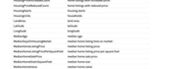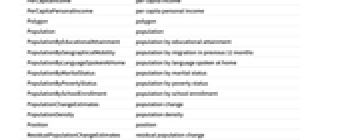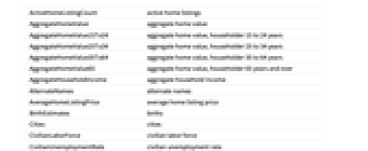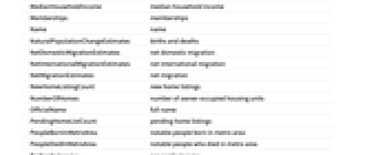 ActiveHomeListingCount active home listings AggregateHomeValue aggregate home value AggregateHomeValue15To24 aggregate home value, householder 15 to 24 years AggregateHomeValue25To34 aggregate home value, householder 25 to 34 years AggregateHomeValue35To64 aggregate home value, householder 35 to 64 years AggregateHomeValue65 aggregate home value, householder 65 years and over AggregateHouseholdIncome aggregate household income AlternateNames alternate names AverageHomeListingPrice average home listing price BirthEstimates births Cities cities CivilianLaborForce civilian labor force CivilianUnemploymentRate civilian unemployment rate Code code Coordinates coordinates Counties counties Country country DeathEstimates deaths EntityClasses entity classes EntityTypeList entity type list GiniIndex Gini index HasPolygon has polygon? HousePriceIndex FHFA home price index HousePriceIndexAnnualAverage FHFA home price index annual average HousingAffordability housing affordability index HousingPermit housing permits HousingPriceIncreasedCount home listings with increased price HousingPriceReducedCount home listings with reduced price HousingStarts housing starts HousingUnits households LandArea land area Latitude latitude Longitude longitude MedianAge median age MedianDaysOnHousingMarket median home listing time on market MedianHomeListingPrice median home listing price MedianHomeListingPricePerSquareFeet median home listing price per square foot MedianHomeSalePrice median home sale price MedianHomeSizeInSquareFeet median home size MedianHomeValue median home value MedianHouseholdIncome median household income Memberships memberships Name name NaturalPopulationChangeEstimates births and deaths NetDomesticMigrationEstimates net domestic migration NetInternationalMigrationEstimates net international migration NetMigrationEstimates net migration NewHomeListingCount new home listings NumberOfHomes number of owner‐occupied housing units OfficialName full name PendingHomeListCount pending home listings PeopleBornInMetroArea notable people born in metro area PeopleDiedInMetroArea notable people who died in metro area PerCapitaIncome per capita income PerCapitaPersonalIncome per capita personal income Polygon polygon Population population PopulationByEducationalAttainment population by educational attainment PopulationByGeographicalMobility population by migration in previous 12 months PopulationByLanguageSpokenAtHome population by language spoken at home PopulationByMaritalStatus population by marital status PopulationByPovertyStatus population by poverty status PopulationBySchoolEnrollment population by school enrollment PopulationChangeEstimates population change PopulationDensity population density Position position ResidualPopulationChangeEstimates residual population change States states SubType sub type Type type UnweightedSampleHousingUnits unweighted sample housing units UnweightedSamplePopulation unweighted sample population Workforce employment ZIPCodes ZIP codes