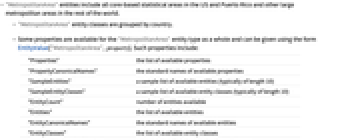 "Properties" the list of available properties "PropertyCanonicalNames" the standard names of available properties "SampleEntities" a sample list of available entities (typically of length 10) "SampleEntityClasses" a sample list of available entity classes (typically of length 10) "EntityCount" number of entities available "Entities" the list of available entities "EntityCanonicalNames" the standard names of available entities "EntityClasses" the list of available entity classes "EntityClassCanonicalNames" the standard names of available entity classes "PropertyClasses" the list of available property classes "PropertyClassCanonicalNames" the standard names of available property classes "PropertyCount" number of properties available - The following annotations can be used in the third argument of EntityValue["MetropolitanArea",property,annotation]: