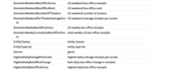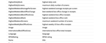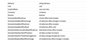 Advisory rating advisory Cast cast CastAndRoles cast and roles Company company Director director DomesticBoxOfficeGross US box office total receipts DomesticDailyBoxOfficeChange US daily box office change in receipts DomesticDailyBoxOfficeGross US daily box office receipts DomesticDailyBoxOfficeRank US daily box office rank DomesticDailyCumulativeBoxOfficeGross total daily US box office receipts DomesticDailyNumberOfTheaters US daily number of screens DomesticDailyPerTheaterAverageGross US daily average receipts per screen DomesticWeekendBoxOfficeChange US weekend box office change in receipts DomesticWeekendBoxOfficeGross US weekend box office receipts DomesticWeekendBoxOfficeRank US weekend box office rank DomesticWeekendNumberOfTheaters US weekend number of screens DomesticWeekendPerTheaterAverageGross US weekend average receipts per screen DomesticWeeklyBoxOfficeGross US weekly box office receipts DomesticWeeklyCumulativeBoxOfficeGross total weekly US box office receipts EntityClasses entity classes EntityTypeList entity type list Genres genre HighestDailyAveragePerScreen highest daily average receipts per screen HighestDailyBoxOfficeChange best daily box office change in receipts HighestDailyBoxOfficeGross highest daily box office receipts HighestDailyRank highest daily rank HighestDailyScreens maximum daily number of screens HighestWeekendAveragePerScreen highest weekend average receipts per screen HighestWeekendBoxOfficeChange best weekend box office change in receipts HighestWeekendBoxOfficeGross highest weekend box office receipts HighestWeekendRank highest weekend box office rank HighestWeekendScreens maximum weekend number of screens HighestWeeklyBoxOfficeGross highest weekly US box office receipts Image image InternationalBoxOfficeGross international box office total receipts Language language MPAARating MPAA rating Name title Producers producer ProductionBudget production budget ReleaseDate release date Runtime runtime WorkingTitles working title WorldwideBoxOfficeGross worldwide box office total receipts Writers writer