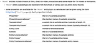 "Properties" the list of available properties "PropertyCanonicalNames" the standard names of available properties "SampleEntities" a sample list of available entities (typically of length 10) "SampleEntityClasses" a sample list of available entity classes (typically of length 10) "EntityCount" number of entities available "Entities" the list of available entities "EntityCanonicalNames" the standard names of available entities "EntityClasses" the list of available entity classes "EntityClassCanonicalNames" the standard names of available entity classes "PropertyClasses" the list of available property classes "PropertyClassCanonicalNames" the standard names of available property classes "PropertyCount" number of properties available - The following annotations can be used in the third argument of EntityValue["Movie",property,annotation]: