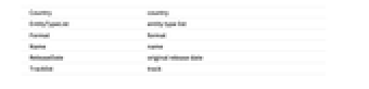Country country EntityTypeList entity type list Format format Name name ReleaseDate original release date Tracklist track