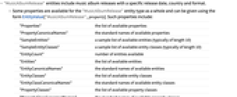 - Some properties are available for the "MusicAlbumRelease" entity type as a whole and can be given using the form EntityValue["MusicAlbumRelease",property]. Such properties include: