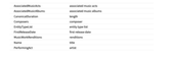 AssociatedMusicActs associated music acts AssociatedMusicAlbums associated music albums CanonicalDuration length Composers composer EntityTypeList entity type list FirstReleaseDate first release date MusicWorkRenditions renditions Name title PerformingAct artist