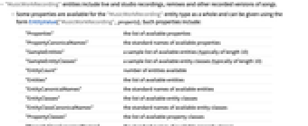 - Some properties are available for the "MusicWorkRecording" entity type as a whole and can be given using the form EntityValue["MusicWorkRecording",property]. Such properties include: