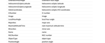 AlphanumericName alphanumeric name AlternateNames alternate names Altitude altitude AltitudeTransit next transit altitude AngularDiameterFromEarth angular diameter AngularRadiusFromEarth angular radius ApparentAltitude apparent altitude ApparentMagnitude apparent magnitude Azimuth azimuth AzimuthRise azimuth at rise AzimuthSet azimuth at set BlueBandMagnitude blue band magnitude BooleanRise above the horizon Classes classes Constellation constellation DailyTimeAboveHorizon daily time above horizon Declination declination Diameter average diameter DistanceFromEarth distance from Earth DistanceFromSun distance from Sun EntityClasses entity classes EntityTypeList entity type list GalacticLatitude galactic latitude GalacticLongitude galactic longitude GeocentricEclipticLatitude geocentric ecliptic latitude GeocentricEclipticLongitude geocentric ecliptic longitude GreenwichHourAngle Greenwich hour angle HeliocentricEclipticLatitude heliocentric ecliptic latitude HeliocentricEclipticLongitude heliocentric ecliptic longitude HelioCoordinates heliocentric ecliptic XYZ coordinates ICNumber IC number Image image LocalHourAngle local hour angle MajorAxis major axis MaximalAltitudeTime next maximum altitude time MinorAxis minor axis Name name NGCNumber NGC number ObjectType object type PositionAngle position angle RadialVelocity radial velocity Radius average radius Redshift redshift RightAscension right ascension RiseTime next rise SetTime next set SiderealHourAngle sidereal hour angle TransitTime next transit time VisualBandMagnitude visual band magnitude ZenithAngle zenith angle
