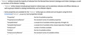 "Properties" the list of available properties "PropertyCanonicalNames" the standard names of available properties "SampleEntities" a sample list of available entities (typically of length 10) "SampleEntityClasses" a sample list of available entity classes (typically of length 10) "EntityCount" number of entities available "Entities" the list of available entities "EntityCanonicalNames" the standard names of available entities "EntityClasses" the list of available entity classes "EntityClassCanonicalNames" the standard names of available entity classes "PropertyClasses" the list of available property classes "PropertyClassCanonicalNames" the standard names of available property classes "PropertyCount" number of properties available - The following annotations can be used in the third argument of EntityValue["Nebula",property,annotation]: