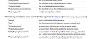 "Source" source information for the property "Date" the date associated with the entity-property value (if any) "EntityAssociation" an association of entities and entity-property values "PropertyAssociation" an association of properties and entity-property values "EntityPropertyAssociation" an association in which the specified entities are keys, and values are a nested association of properties and entity-property values "PropertyEntityAssociation" an association in which the specified properties are keys, and values are a nested association of entities and entity-property values "Dataset" a dataset in which the specified entities are keys, and values are an association of property names and entity-property values - The following annotations can be used in the second argument of EntityValue[property,annotation]:
