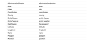 AdministrativeDivision administrative division Area area Cities city Coordinates coordinates County county EntityClasses entity classes EntityTypeList entity type list HasPolygon has polygon? Latitude latitude Longitude longitude Name name Polygon polygon Position position