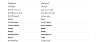 CPUSpeed CPU speed CPUType CPU type DateAnnounced date announced DateDiscontinued date discontinued DateReleased release date Depth depth EntityClasses entity classes EntityTypeList entity type list Height height Image image Manufacturer manufacturer Name name NumberSold number sold OperatingSystem operating system OriginalPrice original price RAMAmount RAM amount Weight weight Width width