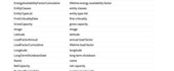 AdministrativeDivisions administrative divisions AnnualEnergyAvailabilityFactor annual energy availability factor AnnualEnergyProduction annual energy production CapacityAnnual annual net capacity Cities city CommercialOperationStartDate first commercial operation ConnectedToGridDate connection to grid ConstructionStartDate construction started Coordinates coordinates Countries country CumulativeEnergyProduced cumulative energy produced CumulativeEnergyUnavailableFactor cumulative energy unavailable factor CumulativeOperatingFactor cumulative operating factor EnergyAvailabilityFactorCumulative lifetime energy availability factor EntityClasses entity classes EntityTypeList entity type list FirstCriticalityDate first criticality GrossCapacity gross capacity Image image Latitude latitude LoadFactorAnnual annual load factor LoadFactorCumulative lifetime load factor Longitude longitude LongTermShutdownDate long term shutdown Name name NetCapacity net capacity NuclearReactorSite nuclear reactor site OperationalFactorAnnual annual operational factor OperationalFactorCumulative lifetime operational factor Operator operator Owner owner PermanentShutdownDate permanent shutdown Position position Status status TimeOnLineAnnual annual time on line TimeOnLineCumulative lifetime time on line Type reactor type