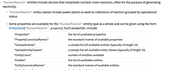 "Properties" the list of available properties "PropertyCanonicalNames" the standard names of available properties "SampleEntities" a sample list of available entities (typically of length 10) "SampleEntityClasses" a sample list of available entity classes (typically of length 10) "EntityCount" number of entities available "Entities" the list of available entities "EntityCanonicalNames" the standard names of available entities "EntityClasses" the list of available entity classes "EntityClassCanonicalNames" the standard names of available entity classes "PropertyClasses" the list of available property classes "PropertyClassCanonicalNames" the standard names of available property classes "PropertyCount" number of properties available - The following annotations can be used in the third argument of EntityValue["NuclearReactor",property,annotation]: