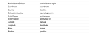 AdministrativeDivision administrative region Coordinates coordinates Country location DetonationCountry operating country EntityClasses entity classes EntityTypeList entity type list Latitude latitude Longitude longitude Name name Position position