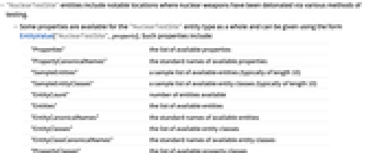 - Some properties are available for the "NuclearTestSite" entity type as a whole and can be given using the form EntityValue["NuclearTestSite",property]. Such properties include: