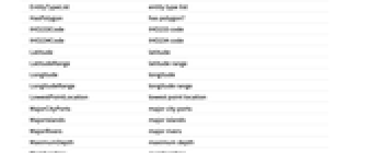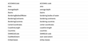 ACICM491Code ACICM491 code Area area AverageDepth average depth Basins basins BorderingBodiesOfWater bordering bodies of water BorderingContinents bordering continents BorderingCountries bordering countries CenterCoordinates center coordinates CoastlineLength coastline length Countries countries DIAM6518Code DIAM6518 code EastWestExtent east-west extent EntityClasses entity classes EntityTypeList entity type list HasPolygon has polygon? IHO233Code IHO233 code IHO234Code IHO234 code Latitude latitude LatitudeRange latitude range Longitude longitude LongitudeRange longitude range LowestPointLocation lowest point location MajorCityPorts major city ports MajorIslands major islands MajorRivers major rivers MaximumDepth maximum depth Memberships memberships Name name NaturalResources natural resources NorthSouthExtent north-south extent PercentAreaOfEarthsSurface percentage of earth's surface Polygon polygon Position position Salinity typical salinity UnderseaFeatures undersea features