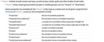 - "Ocean" entity classes group entities by type or notable groups, such as "Oceans" or "SevenSeas".