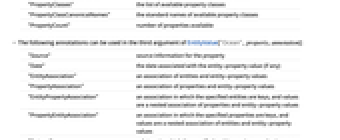 "Source" source information for the property "Date" the date associated with the entity-property value (if any) "EntityAssociation" an association of entities and entity-property values "PropertyAssociation" an association of properties and entity-property values "EntityPropertyAssociation" an association in which the specified entities are keys, and values are a nested association of properties and entity-property values "PropertyEntityAssociation" an association in which the specified properties are keys, and values are a nested association of entities and entity-property values "Dataset" a dataset in which the specified entities are keys, and values are an association of property names and entity-property values - The following annotations can be used in the second argument of EntityValue[property,annotation]:
