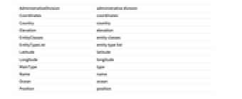 AdministrativeDivision administrative division Coordinates coordinates Country country Elevation elevation EntityClasses entity classes EntityTypeList entity type list Latitude latitude Longitude longitude MainType type Name name Ocean ocean Position position