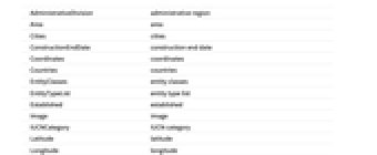 AdministrativeDivision administrative region Area area Cities cities ConstructionEndDate construction end date Coordinates coordinates Countries countries EntityClasses entity classes EntityTypeList entity type list Established established Image image IUCNCategory IUCN category Latitude latitude Longitude longitude Name name OpeningDate opening date Position position Type type Visitors visitors Website website