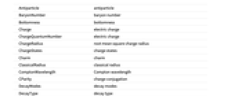 Antiparticle antiparticle BaryonNumber baryon number Bottomness bottomness Charge electric charge ChargeQuantumNumber electric charge ChargeRadius root mean square charge radius ChargeStates charge states Charm charm ClassicalRadius classical radius ComptonWavelength Compton wavelength CParity charge conjugation DecayModes decay modes DecayType decay type ElectricChargeDensity electric charge density EntityClasses entity classes EntityTypeList entity type list Excitations excitations FullDecayModes decay modes FullSymbol full symbol GenericFullSymbol generic full symbol GenericSymbol generic symbol GFactor spin g‐factor GParity G‐parity HalfLife half‐life Hypercharge hypercharge Isospin isospin IsospinGParity