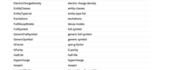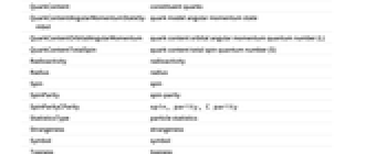 IsospinMultiplet isospin multiplet IsospinPartners isospin partners IsospinProjection isospin projection LeptonNumber lepton number Lifetime mean lifetime Mass mass MassDensity mass density MeanSquareChargeRadius mean square charge radius Memberships memberships Name name Parity parity ParticleInteractionsStudied interactions studied PDGNumber PDG number QuarkContent constituent quarks QuarkContentAngularMomentumStateSymbol quark model angular momentum state QuarkContentOrbitalAngularMomentum quark content orbital angular momentum quantum number (L) QuarkContentTotalSpin quark content total spin quantum number (S) Radioactivity radioactivity Radius radius Spin spin SpinParity spin‐parity SpinParityCParity