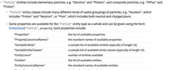 "Properties" the list of available properties "PropertyCanonicalNames" the standard names of available properties "SampleEntities" a sample list of available entities (typically of length 10) "SampleEntityClasses" a sample list of available entity classes (typically of length 10) "EntityCount" number of entities available "Entities" the list of available entities "EntityCanonicalNames" the standard names of available entities "EntityClasses" the list of available entity classes "EntityClassCanonicalNames" the standard names of available entity classes "PropertyClasses" the list of available property classes "PropertyClassCanonicalNames" the standard names of available property classes "PropertyCount" number of properties available - The following annotations can be used in the third argument of EntityValue["Particle",property,annotation]: