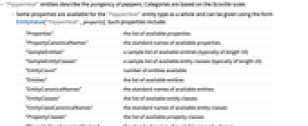 "Properties" the list of available properties "PropertyCanonicalNames" the standard names of available properties "SampleEntities" a sample list of available entities (typically of length 10) "SampleEntityClasses" a sample list of available entity classes (typically of length 10) "EntityCount" number of entities available "Entities" the list of available entities "EntityCanonicalNames" the standard names of available entities "EntityClasses" the list of available entity classes "EntityClassCanonicalNames" the standard names of available entity classes "PropertyClasses" the list of available property classes "PropertyClassCanonicalNames" the standard names of available property classes "PropertyCount" number of properties available - The following annotations can be used in the third argument of EntityValue["PepperHeat",property,annotation]: