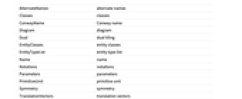 AlternateNames alternate names Classes classes ConwayName Conway name Diagram diagram Dual dual tiling EntityClasses entity classes EntityTypeList entity type list Name name Notations notations Parameters parameters PrimitiveUnit primitive unit Symmetry symmetry TranslationVectors translation vectors