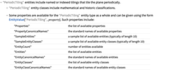 "Properties" the list of available properties "PropertyCanonicalNames" the standard names of available properties "SampleEntities" a sample list of available entities (typically of length 10) "SampleEntityClasses" a sample list of available entity classes (typically of length 10) "EntityCount" number of entities available "Entities" the list of available entities "EntityCanonicalNames" the standard names of available entities "EntityClasses" the list of available entity classes "EntityClassCanonicalNames" the standard names of available entity classes "PropertyClasses" the list of available property classes "PropertyClassCanonicalNames" the standard names of available property classes "PropertyCount" number of properties available - The following annotations can be used in the third argument of EntityValue["PeriodicTiling",property,annotation]: