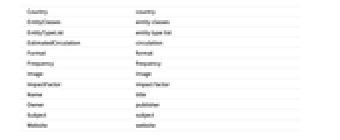 Country country EntityClasses entity classes EntityTypeList entity type list EstimatedCirculation circulation Format format Frequency frequency Image image ImpactFactor impact factor Name title Owner publisher Subject subject Website website