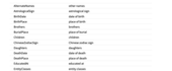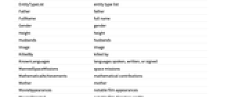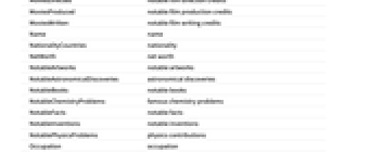 AlternateNames other names AstrologicalSign astrological sign BirthDate date of birth BirthPlace place of birth Brothers brothers BurialPlace place of burial Children children ChineseZodiacSign Chinese zodiac sign Daughters daughters DeathDate date of death DeathPlace place of death EducatedAt educated at EntityClasses entity classes EntityTypeList entity type list Father father FullName full name Gender gender Height height Husbands husbands Image image KilledBy killed by KnownLanguages languages spoken, written, or signed MannedSpaceMissions space missions MathematicalAchievements mathematical contributions Mother mother MovieAppearances notable film appearances MoviesDirected notable film direction credits MoviesProduced notable film production credits MoviesWritten notable film writing credits Name name NationalityCountries nationality NetWorth net worth NotableArtworks notable artworks NotableAstronomicalDiscoveries astronomical discoveries NotableBooks notable books NotableChemistryProblems famous chemistry problems NotableFacts notable facts NotableInventions notable inventions NotablePhysicsProblems physics contributions Occupation occupation Parents parents Pets pets ResidedAt place of residence Siblings siblings Sisters sisters Sons sons Spouses spouses Weight weight Wives wives