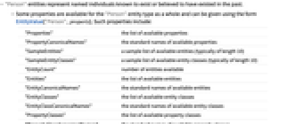 "Properties" the list of available properties "PropertyCanonicalNames" the standard names of available properties "SampleEntities" a sample list of available entities (typically of length 10) "SampleEntityClasses" a sample list of available entity classes (typically of length 10) "EntityCount" number of entities available "Entities" the list of available entities "EntityCanonicalNames" the standard names of available entities "EntityClasses" the list of available entity classes "EntityClassCanonicalNames" the standard names of available entity classes "PropertyClasses" the list of available property classes "PropertyClassCanonicalNames" the standard names of available property classes "PropertyCount" number of properties available - The following annotations can be used in the third argument of EntityValue["Person",property,annotation]: