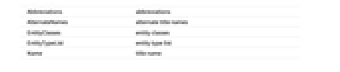 Abbreviations abbreviations AlternateNames alternate title names EntityClasses entity classes EntityTypeList entity type list Name title name