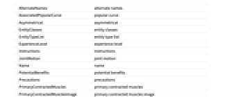 AlternateNames alternate names AssociatedPopularCurve popular curve Asymmetrical asymmetrical EntityClasses entity classes EntityTypeList entity type list ExperienceLevel experience level Instructions instructions JointMotion joint motion Name name PotentialBenefits potential benefits Precautions precautions PrimaryContractedMuscles primary contracted muscles PrimaryContractedMusclesImage primary contracted muscles image Schematic schematic SimplifiedSchematic simplified schematic SitesOfImprovedMobility sites of improved mobility SitesOfImprovedStrength sites of improved strength SitesOfRecentSurgeryInjuryInflammation sites of recent surgery, injury, or inflammation StartingPosition starting position StretchedMuscles stretched muscles StretchedMusclesImage stretched muscles image SupportingMuscles supporting muscles SupportingMusclesImage supporting muscles image Variations variations