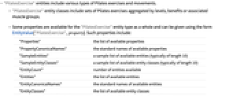 "Properties" the list of available properties "PropertyCanonicalNames" the standard names of available properties "SampleEntities" a sample list of available entities (typically of length 10) "SampleEntityClasses" a sample list of available entity classes (typically of length 10) "EntityCount" number of entities available "Entities" the list of available entities "EntityCanonicalNames" the standard names of available entities "EntityClasses" the list of available entity classes "EntityClassCanonicalNames" the standard names of available entity classes "PropertyClasses" the list of available property classes "PropertyClassCanonicalNames" the standard names of available property classes "PropertyCount" number of properties available - The following annotations can be used in the third argument of EntityValue["PilatesExercise",property,annotation]: