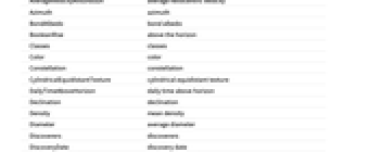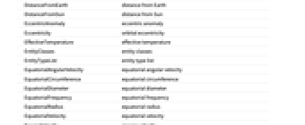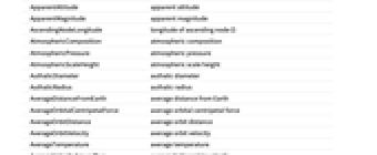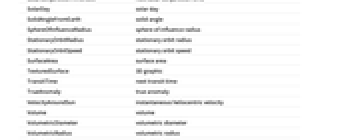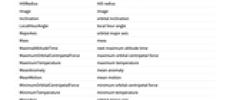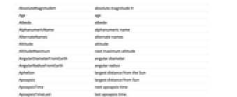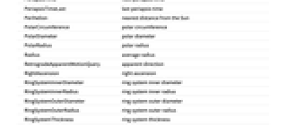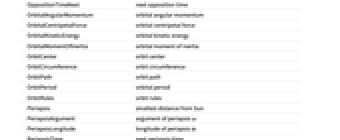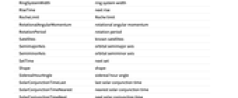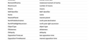 AbsoluteMagnitudeH absolute magnitude H Age age Albedo albedo AlphanumericName alphanumeric name AlternateNames alternate names Altitude altitude AltitudeMaximum next maximum altitude AngularDiameterFromEarth angular diameter AngularRadiusFromEarth angular radius Aphelion largest distance from the Sun Apoapsis largest distance from Sun ApoapsisTime next apoapsis time ApoapsisTimeLast last apoapsis time ApparentAltitude apparent altitude ApparentMagnitude apparent magnitude AscendingNodeLongitude longitude of ascending node Ω AtmosphericComposition atmospheric composition AtmosphericPressure atmospheric pressure AtmosphericScaleHeight atmospheric scale height AuthalicDiameter authalic diameter AuthalicRadius authalic radius AverageDistanceFromEarth average distance from Earth AverageOrbitalCentripetalForce average orbital centripetal force AverageOrbitDistance average orbit distance AverageOrbitVelocity average orbit velocity AverageTemperature average temperature AverageVelocityAroundSun average heliocentric velocity Azimuth azimuth BondAlbedo bond albedo BooleanRise above the horizon Classes classes Color color Constellation constellation CylindricalEquidistantTexture cylindrical equidistant texture DailyTimeAboveHorizon daily time above horizon Declination declination Density mean density Diameter average diameter Discoverers discoverers DiscoveryDate discovery date DistanceFromEarth distance from Earth DistanceFromSun distance from Sun EccentricAnomaly eccentric anomaly Eccentricity orbital eccentricity EffectiveTemperature effective temperature EntityClasses entity classes EntityTypeList entity type list EquatorialAngularVelocity equatorial angular velocity EquatorialCircumference equatorial circumference EquatorialDiameter equatorial diameter EquatorialFrequency equatorial frequency EquatorialRadius equatorial radius EquatorialVelocity equatorial velocity EscapeVelocity escape velocity FarthestPlanet farthest planet GalacticLatitude galactic latitude GalacticLongitude galactic longitude GeocentricEclipticLatitude geocentric ecliptic latitude GeocentricEclipticLongitude geocentric ecliptic longitude Glyph astrological symbol GravitationalConstantMassProduct gravitational constant mass product Gravity gravity GreenwichHourAngle Greenwich hour angle HeliocentricEclipticLatitude heliocentric ecliptic latitude HeliocentricEclipticLongitude heliocentric ecliptic longitude HelioCoordinates heliocentric ecliptic XYZ coordinates HelioVelocityVector heliocentric velocity vector HillRadius Hill radius Image image Inclination orbital inclination LocalHourAngle local hour angle MajorAxis orbital major axis Mass mass MaximalAltitudeTime next maximum altitude time MaximumOrbitalCentripetalForce maximum orbital centripetal force MaximumTemperature maximum temperature MeanAnomaly mean anomaly MeanMotion mean motion MinimumOrbitalCentripetalForce minimum orbital centripetal force MinimumTemperature minimum temperature MinorAxis orbital minor axis MomentOfInertia rotational moment of inertia MoonCount number of moons Moons moons NAIFIdentifier NAIF identifier Name name NearestPlanet nearest planet NorthPoleDeclination north pole declination NorthPoleRightAscension north pole right ascension ObjectType object type Oblateness oblateness Obliquity obliquity OppositionTimeLast last opposition time OppositionTimeNearest nearest opposition time OppositionTimeNext next opposition time OrbitalAngularMomentum orbital angular momentum OrbitalCentripetalForce orbital centripetal force OrbitalKineticEnergy orbital kinetic energy OrbitalMomentOfInertia orbital moment of inertia OrbitCenter orbit center OrbitCircumference orbit circumference OrbitPath orbit path OrbitPeriod orbital period OrbitRules orbit rules Periapsis smallest distance from Sun PeriapsisArgument argument of periapsis ω PeriapsisLongitude longitude of periapsis ϖ PeriapsisTime next periapsis time PeriapsisTimeLast last periapsis time Perihelion nearest distance from the Sun PolarCircumference polar circumference PolarDiameter polar diameter PolarRadius polar radius Radius average radius RetrogradeApparentMotionQuery apparent direction RightAscension right ascension RingSystemInnerDiameter ring system inner diameter RingSystemInnerRadius ring system inner radius RingSystemOuterDiameter ring system outer diameter RingSystemOuterRadius ring system outer radius RingSystemThickness ring system thickness RingSystemWidth ring system width RiseTime next rise RocheLimit Roche limit RotationalAngularMomentum rotational angular momentum RotationPeriod rotation period Satellites known satellites SemimajorAxis orbital semimajor axis SemiminorAxis orbital semiminor axis SetTime next set Shape shape SiderealHourAngle sidereal hour angle SolarConjunctionTimeLast last solar conjunction time SolarConjunctionTimeNearest nearest solar conjunction time SolarConjunctionTimeNext next solar conjunction time SolarDay solar day SolidAngleFromEarth solid angle SphereOfInfluenceRadius sphere of influence radius StationaryOrbitRadius stationary orbit radius StationaryOrbitSpeed stationary orbit speed SurfaceArea surface area TexturedSurface 3D graphic TransitTime next transit time TrueAnomaly true anomaly VelocityAroundSun instantaneous heliocentric velocity Volume volume VolumetricDiameter volumetric diameter VolumetricRadius volumetric radius ZenithAngle zenith angle