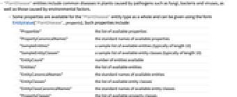 "Properties" the list of available properties "PropertyCanonicalNames" the standard names of available properties "SampleEntities" a sample list of available entities (typically of length 10) "SampleEntityClasses" a sample list of available entity classes (typically of length 10) "EntityCount" number of entities available "Entities" the list of available entities "EntityCanonicalNames" the standard names of available entities "EntityClasses" the list of available entity classes "EntityClassCanonicalNames" the standard names of available entity classes "PropertyClasses" the list of available property classes "PropertyClassCanonicalNames" the standard names of available property classes "PropertyCount" number of properties available - The following annotations can be used in the third argument of EntityValue["PlantDisease",property,annotation]: