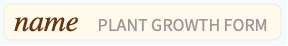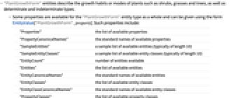 - "PlantGrowthForm" entities describe the growth habits or modes of plants such as shrubs, grasses and trees, as well as determinate and indeterminate types.