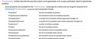 "Properties" the list of available properties "PropertyCanonicalNames" the standard names of available properties "SampleEntities" a sample list of available entities (typically of length 10) "SampleEntityClasses" a sample list of available entity classes (typically of length 10) "EntityCount" number of entities available "Entities" the list of available entities "EntityCanonicalNames" the standard names of available entities "EntityClasses" the list of available entity classes "EntityClassCanonicalNames" the standard names of available entity classes "PropertyClasses" the list of available property classes "PropertyClassCanonicalNames" the standard names of available property classes "PropertyCount" number of properties available - The following annotations can be used in the third argument of EntityValue["PlantHeredity",property,annotation]: