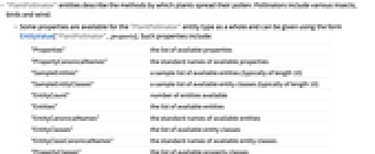- "PlantPollinator" entities describe the methods by which plants spread their pollen. Pollinators include various insects, birds and wind.