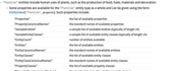 "Properties" the list of available properties "PropertyCanonicalNames" the standard names of available properties "SampleEntities" a sample list of available entities (typically of length 10) "SampleEntityClasses" a sample list of available entity classes (typically of length 10) "EntityCount" number of entities available "Entities" the list of available entities "EntityCanonicalNames" the standard names of available entities "EntityClasses" the list of available entity classes "EntityClassCanonicalNames" the standard names of available entity classes "PropertyClasses" the list of available property classes "PropertyClassCanonicalNames" the standard names of available property classes "PropertyCount" number of properties available - The following annotations can be used in the third argument of EntityValue["PlantUse",property,annotation]: