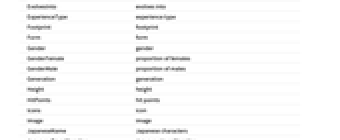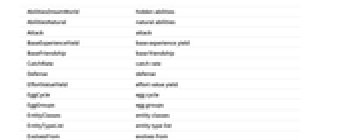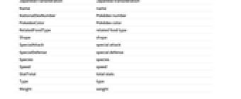 AbilitiesDreamWorld hidden abilities AbilitiesNatural natural abilities Attack attack BaseExperienceYield base experience yield BaseFriendship base friendship CatchRate catch rate Defense defense EffortValueYield effort value yield EggCycle egg cycle EggGroups egg groups EntityClasses entity classes EntityTypeList entity type list EvolvesFrom evolves from EvolvesInto evolves into ExperienceType experience type Footprint footprint Form form Gender gender GenderFemale proportion of females GenderMale proportion of males Generation generation Height height HitPoints hit points Icons icon Image image JapaneseName Japanese characters JapaneseTransliteration Japanese transliteration Name name NationalDexNumber Pokédex number PokedexColor Pokédex color RelatedFoodType related food type Shape shape SpecialAttack special attack SpecialDefense special defense Species species Speed speed StatTotal total stats Type type Weight weight