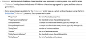 "Properties" the list of available properties "PropertyCanonicalNames" the standard names of available properties "SampleEntities" a sample list of available entities (typically of length 10) "SampleEntityClasses" a sample list of available entity classes (typically of length 10) "EntityCount" number of entities available "Entities" the list of available entities "EntityCanonicalNames" the standard names of available entities "EntityClasses" the list of available entity classes "EntityClassCanonicalNames" the standard names of available entity classes "PropertyClasses" the list of available property classes "PropertyClassCanonicalNames" the standard names of available property classes "PropertyCount" number of properties available - The following annotations can be used in the third argument of EntityValue["Pokemon",property,annotation]: