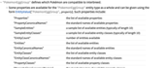 "Properties" the list of available properties "PropertyCanonicalNames" the standard names of available properties "SampleEntities" a sample list of available entities (typically of length 10) "SampleEntityClasses" a sample list of available entity classes (typically of length 10) "EntityCount" number of entities available "Entities" the list of available entities "EntityCanonicalNames" the standard names of available entities "EntityClasses" the list of available entity classes "EntityClassCanonicalNames" the standard names of available entity classes "PropertyClasses" the list of available property classes "PropertyClassCanonicalNames" the standard names of available property classes "PropertyCount" number of properties available - The following annotations can be used in the third argument of EntityValue["PokemonEggGroup",property,annotation]: