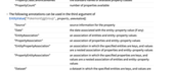 "Source" source information for the property "Date" the date associated with the entity-property value (if any) "EntityAssociation" an association of entities and entity-property values "PropertyAssociation" an association of properties and entity-property values "EntityPropertyAssociation" an association in which the specified entities are keys, and values are a nested association of properties and entity-property values "PropertyEntityAssociation" an association in which the specified properties are keys, and values are a nested association of entities and entity-property values "Dataset" a dataset in which the specified entities are keys, and values are an association of property names and entity-property values - The following annotations can be used in the second argument of EntityValue[property,annotation]: