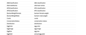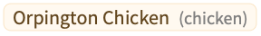 ABAClassification ABA classification AlternateNames alternate names APAClassification APA classification APSClassification APS classification BantamWeightFemale bantam female weight BantamWeightMale bantam male weight Comb comb ConservationStatus conservation status Distribution distribution EggColor egg color EggImage egg image EggSize egg size EggYield annual egg yield EntityClasses entity classes EntityTypeList entity type list Image image Name name Origin origin PCGBClassification PCGB classification SkinColor skin color Species species SubLabel sub label Uses uses WeightFemale female weight WeightMale male weight