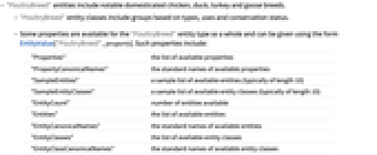 - "PoultryBreed" entity classes include groups based on types, uses and conservation status.