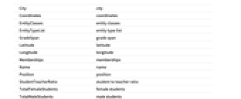City city Coordinates coordinates EntityClasses entity classes EntityTypeList entity type list GradeSpan grade span Latitude latitude Longitude longitude Memberships memberships Name name Position position StudentTeacherRatio student to teacher ratio TotalFemaleStudents female students TotalMaleStudents male students TotalStudents students TotalTeachersFullTimeEquivalent total teachers